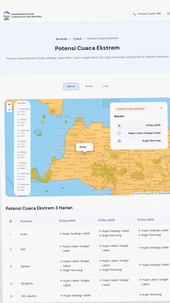 JOGJAOKE.COM, Serang – Polda Banten mengimbau masyarakat untuk meningkatkan kewaspadaan terhadap potensi cuaca ekstrem di sejumlah wilayah Provinsi Banten berdasarkan prakiraan cuaca Badan Meteorologi, Klimatologi, dan Geofisika (BMKG) Banten hari ini, Sabtu (13/12).