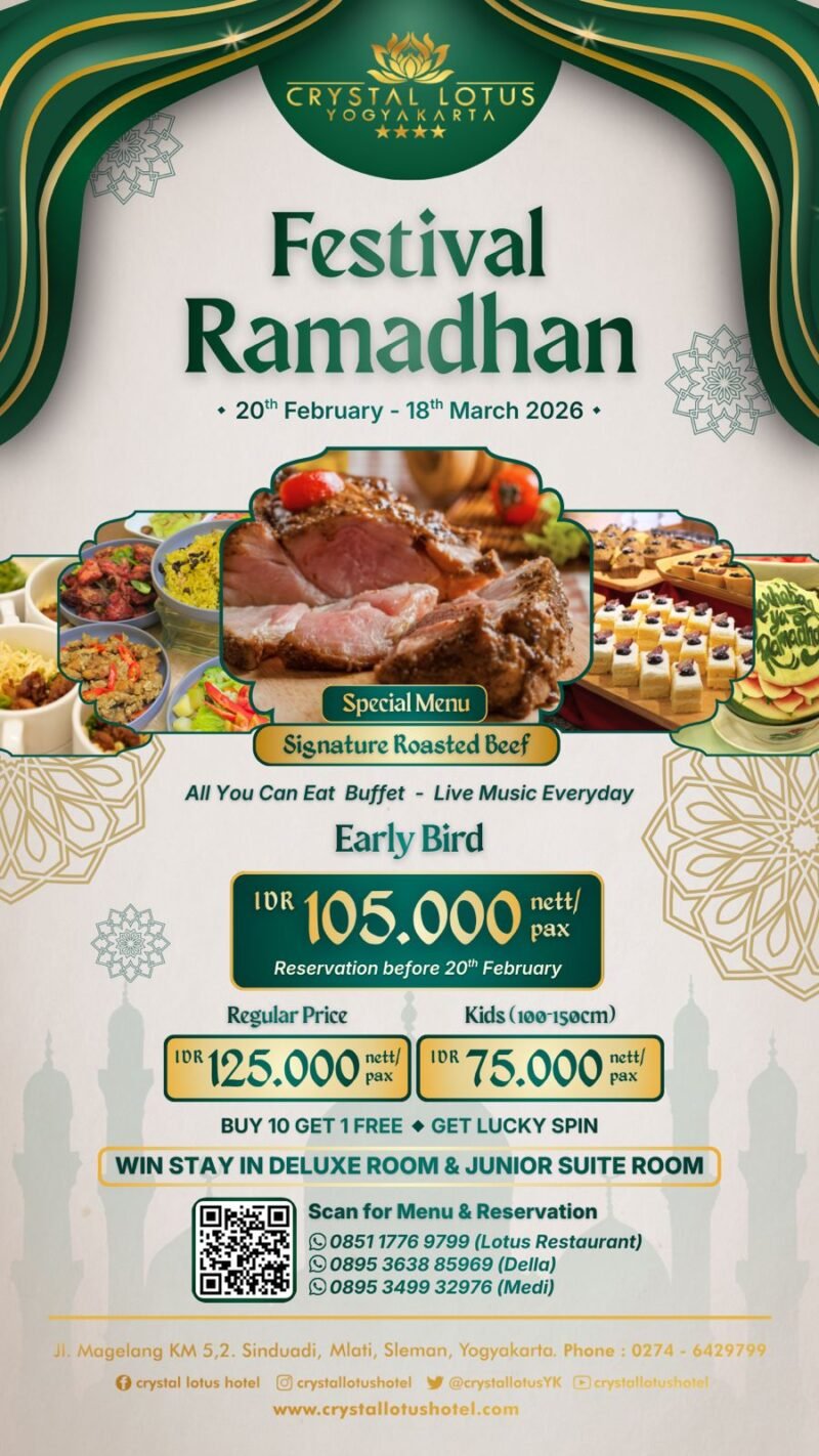 JOGJAOKE.COM, YOGYAKARTA — Menyambut bulan suci Ramadhan 2026, Crystal Lotus Hotel Yogyakarta menghadirkan program spesial bertajuk Festival Ramadhan, yang dirancang untuk memberikan pengalaman berbuka puasa yang hangat, berkesan, dan penuh makna.