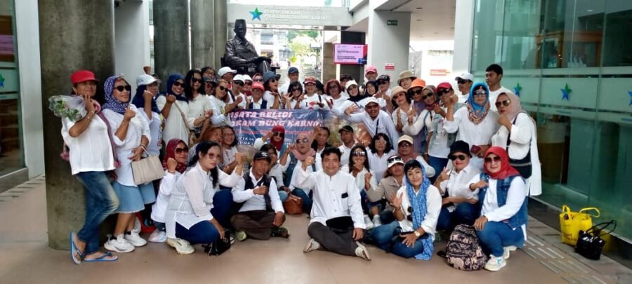 Di hadapan nisan bertuliskan “Ir. Soekarno, Proklamator/Presiden RI Pertama”, para peserta mengenakan pakaian atasan bernuansa putih, warna yang identik dengan kesucian.