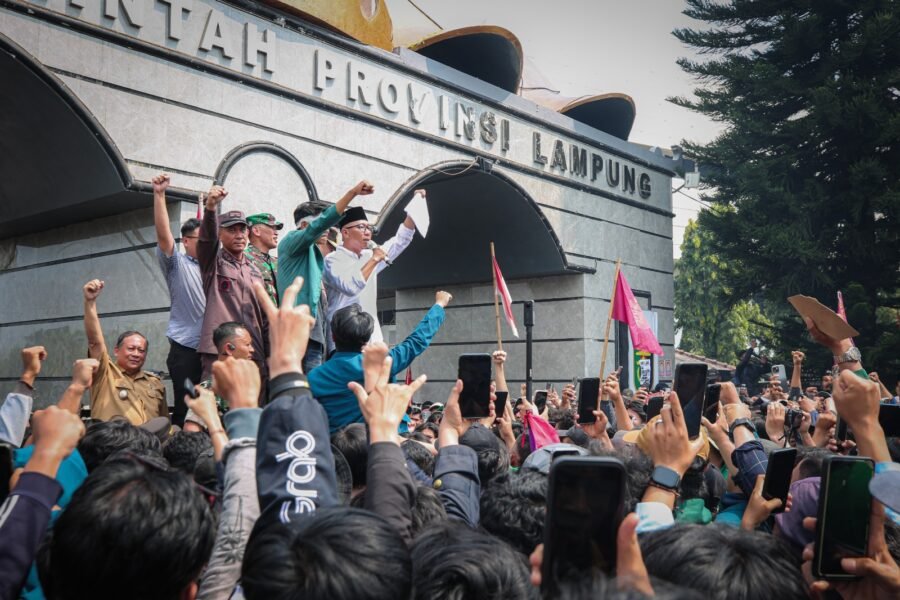 JOGJAOKE.COM, Bandar Lampung — Suara Rakyat Didengar, Gubernur Lampung Rahmat Mirzani Djausal bersama jajaran Forum Koordinasi Pimpinan Daerah (Forkopimda) Provinsi Lampung menyambut ribuan massa demonstrasi dengan aksi damai di depan gerbang kantor Pemerintah Provinsi Lampung, Senin (1/9/2025).