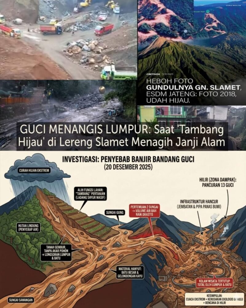 Hari ini, Guci sedang dibersihkan dari lumpur. Namun, selama “tambang sayur” di lereng Slamet terus menggerogoti hutan lindung tanpa kendali, lumpur di Pancuran 13 hanyalah sebuah peringatan awal. Gunung Slamet tidak sedang marah, ia hanya sedang mengembalikan apa yang tidak sanggup lagi ia tahan.