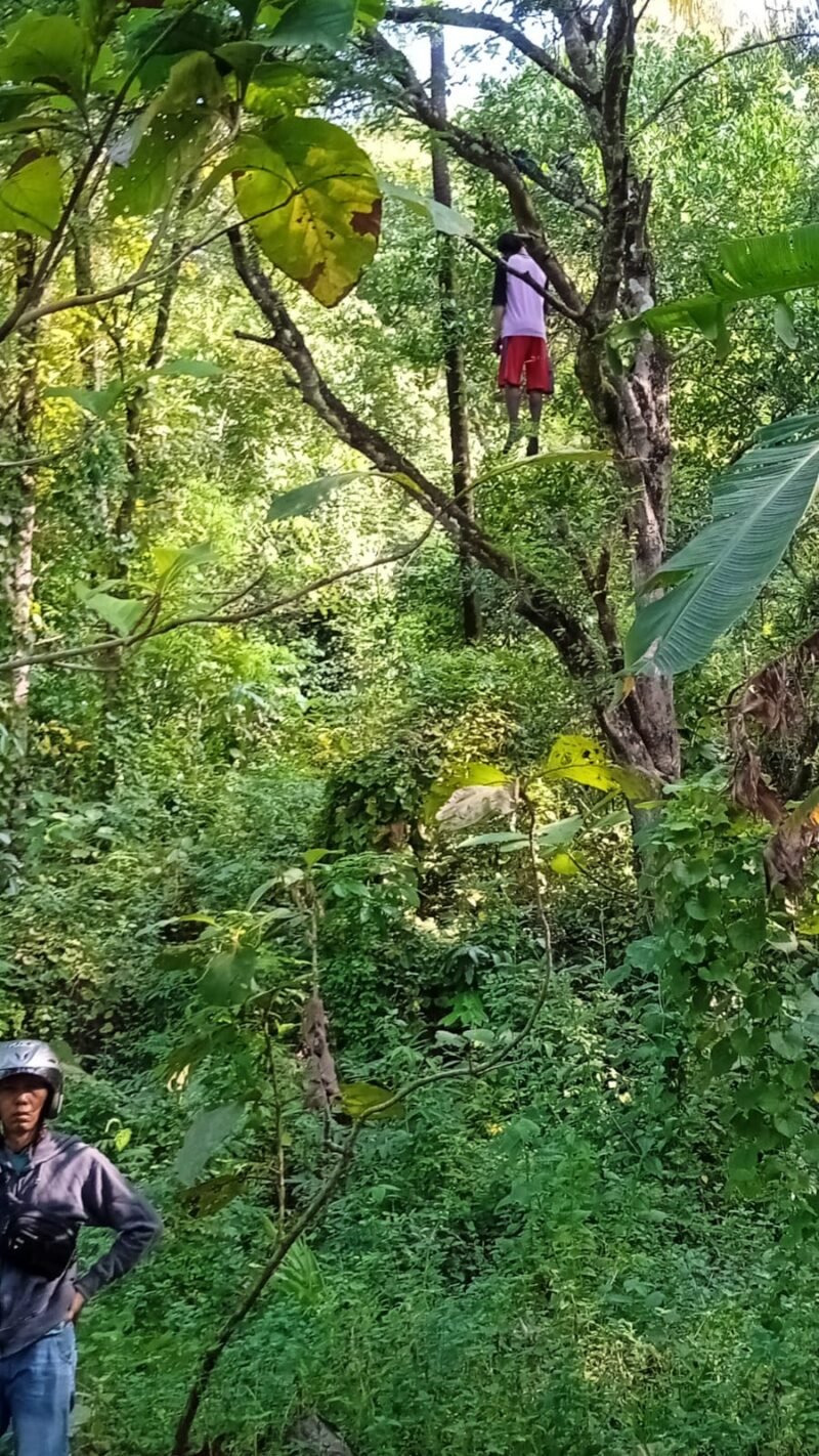“Istri saya tiba-tiba teriak histeris sambil lari ke arah saya, katanya ada orang gantung diri di pohon,” ujar Suhadi saat ditemui di lokasi.