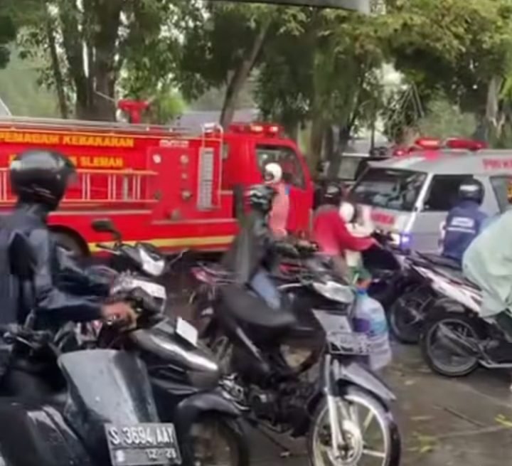 Tak lama berselang, ambulans PMI Sleman dan mobil pemadam kebakaran tiba untuk mengevakuasi korban dengan hati-hati.