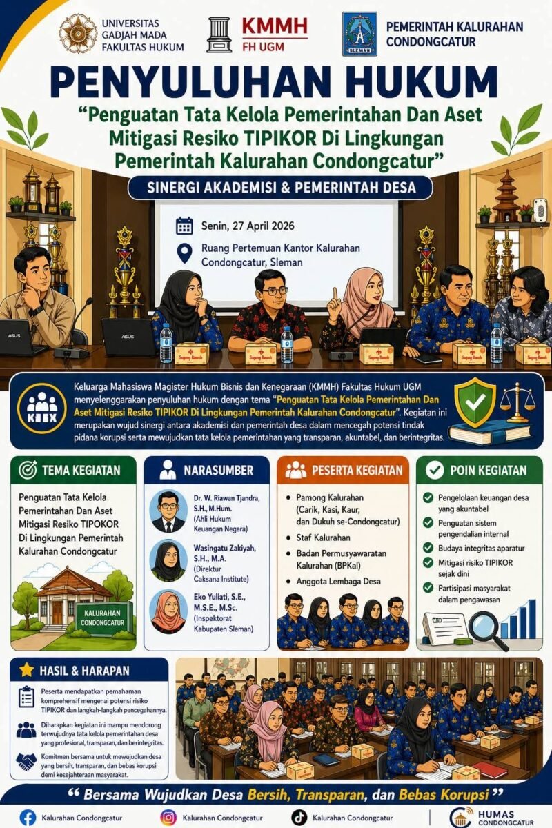 JOGJAOKE.COM, SLEMAN – Kegiatan penyuluhan hukum yang digelar Keluarga Mahasiswa Magister Hukum Bisnis dan Kenegaraan Fakultas Hukum UGM (KMMH FH UGM) di Kalurahan Condongcatur, Senin (27/4/2026), menegaskan pentingnya sinergi antara akademisi dan pemerintah desa dalam mencegah korupsi.