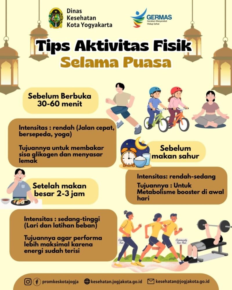 Melalui panduan ini, Dinas Kesehatan Kota Yogyakarta berharap masyarakat tetap dapat menjaga kebugaran tubuh selama menjalani puasa. Aktivitas fisik yang dilakukan dengan waktu dan intensitas yang tepat dinilai dapat membantu menjaga kesehatan serta meningkatkan daya tahan tubuh selama Ramadan. (Aga)