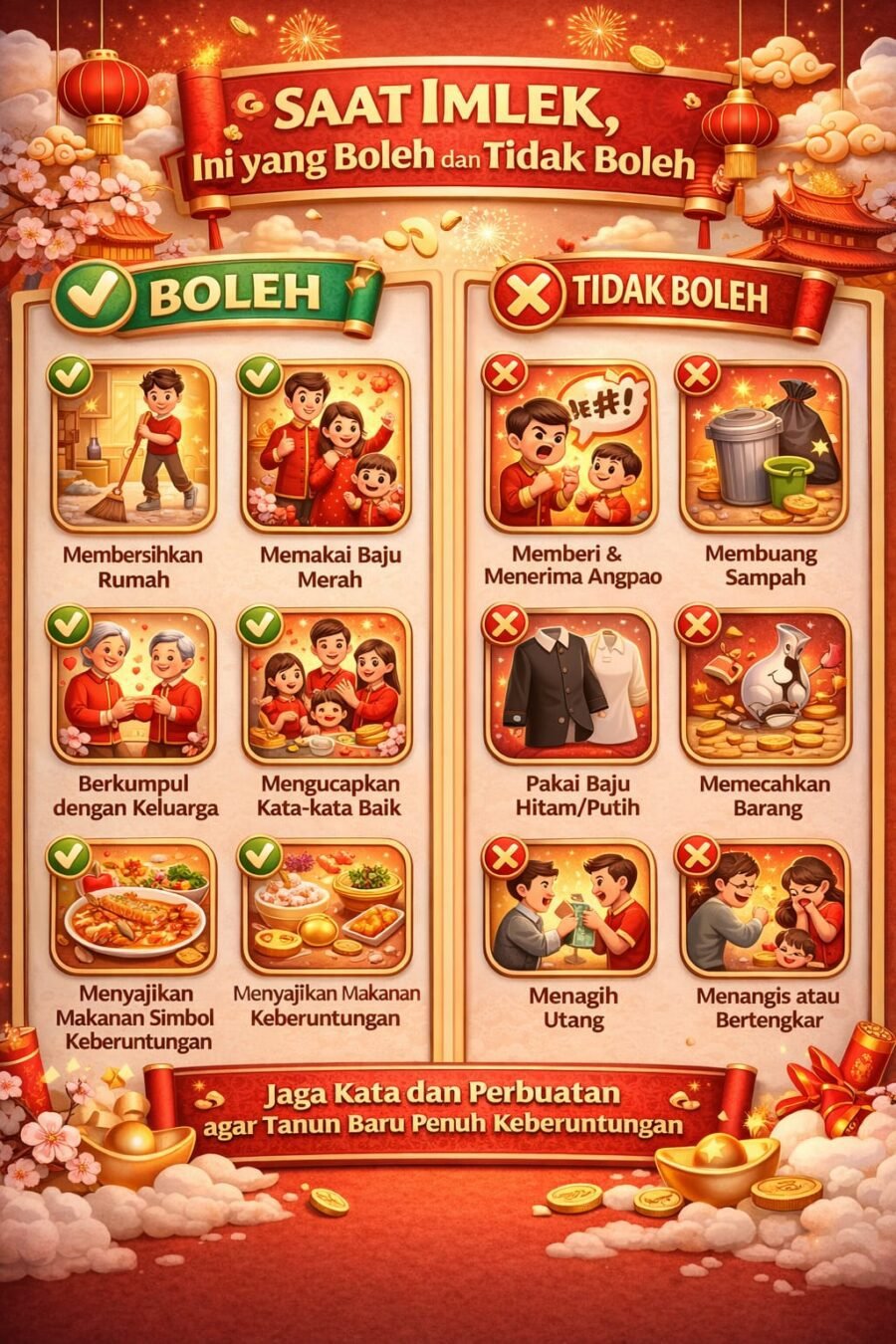 Di balik berbagai kebiasaan yang dianjurkan, terdapat pula sejumlah pantangan yang sebaiknya dihindari saat Imlek. Menyapu atau membuang sampah pada hari pertama Imlek, misalnya, dipercaya dapat membuang keberuntungan yang baru datang. Begitu pula dengan mengucapkan kata-kata negatif, bertengkar, atau menangis, yang diyakini dapat membawa energi buruk sepanjang tahun.
