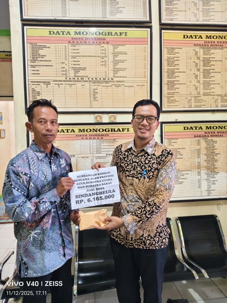 JOGJAOKE.COM, Sindangheula – Pemerintah Desa Sindangheula, Kecamatan Pabuaran, resmi menyalurkan donasi kemanusiaan untuk korban bencana banjir bandang yang terjadi di Provinsi Aceh, Sumatra Barat, dan Sumatra Utara. Penyaluran dilakukan pada Kamis, 11 Desember 2025, oleh Kepala Desa Sindangheula Suheli, S.Kom.I., MM, dan diterima langsung oleh Kasi Ekbang Kecamatan Pabuaran, Khairudin, untuk kemudian dihimpun di tingkat Kabupaten Serang sebelum disalurkan ke wilayah terdampak.