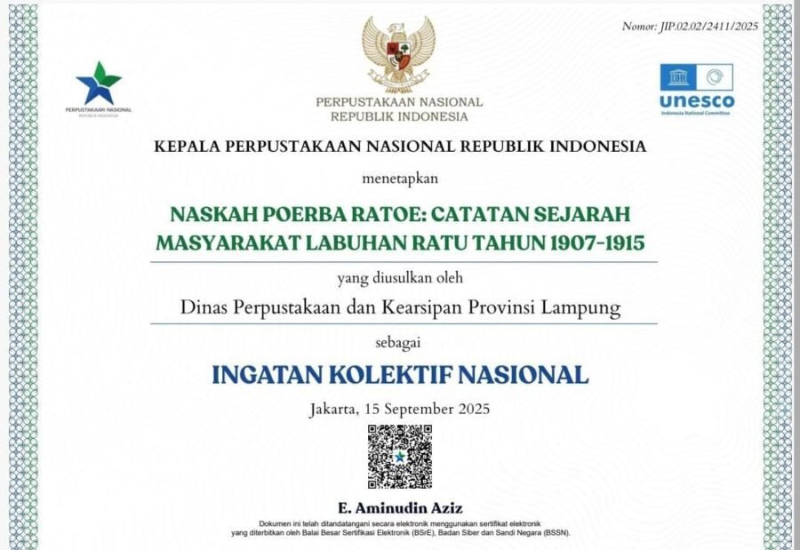 JOGJAOKE.COM, Bandar Lampung — Prestasi membanggakan kembali diraih oleh Provinsi Lampung di kancah nasional. Dua naskah kuno asal Provinsi Lampung berhasil meraih Sertifikat IKON (Ingatan Kolektif Nasional) Tahun 2025 dari Perpustakaan Nasional Republik Indonesia (Perpusnas RI).