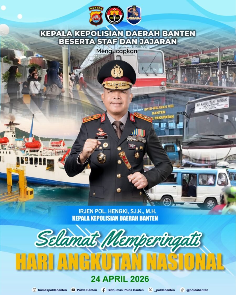 JOGJAOKE.COM, Serang – Dalam rangka memperingati Hari Angkutan Nasional yang jatuh pada 24 April 2026, Kepala Kepolisian Daerah Banten Irjen Pol. Hengki menyampaikan ucapan selamat sekaligus apresiasi kepada seluruh insan transportasi atas dedikasinya dalam menjaga kelancaran mobilitas masyarakat.