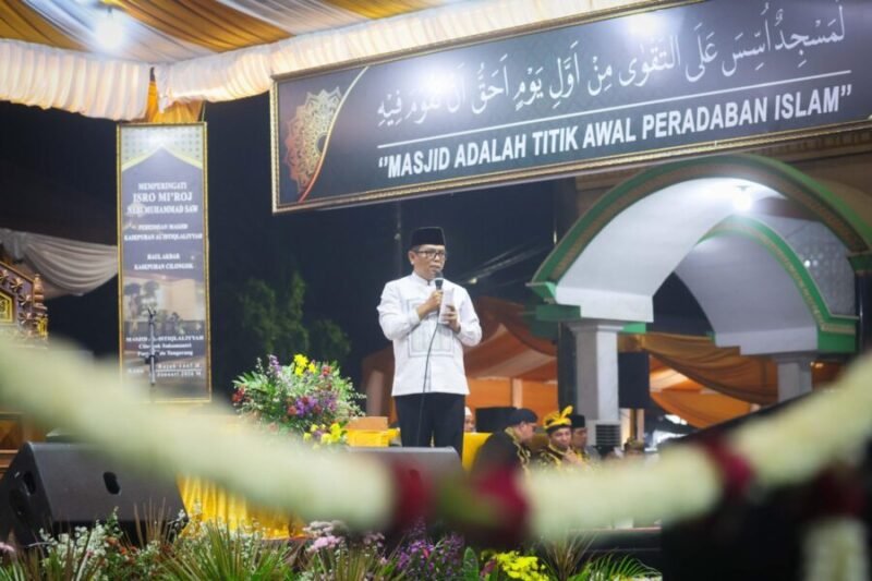 JOGJAOKE.COM, Kab. Tangerang – Gubernur Banten Andra Soni, meresmikan Masjid Al-Istiqlaliyyah sekaligus menghadiri peringatan Isra Mikraj Nabi Muhammad SAW di Pondok Pesantren Al-Istiqlaliyyah, Kampung Cilongok, Kecamatan Pasar Kemis, Kabupaten Tangerang, pada Kamis (14/1/2026) malam. Dalam sambutannya, Gubernur menegaskan bahwa masjid bukan sekadar tempat ibadah, melainkan titik awal dan pilar utama pembangunan peradaban Islam.