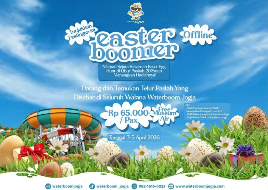 JOGJAOKE.COM, YOGYAKARTA — Waterboom Jogja menggelar program spesial bertajuk “Easter Boomer” dalam rangka menyambut libur panjang Paskah 2026. Kegiatan ini berlangsung pada 3 hingga 5 April 2026 dengan menghadirkan beragam aktivitas hiburan dan promo tiket bagi pengunjung.